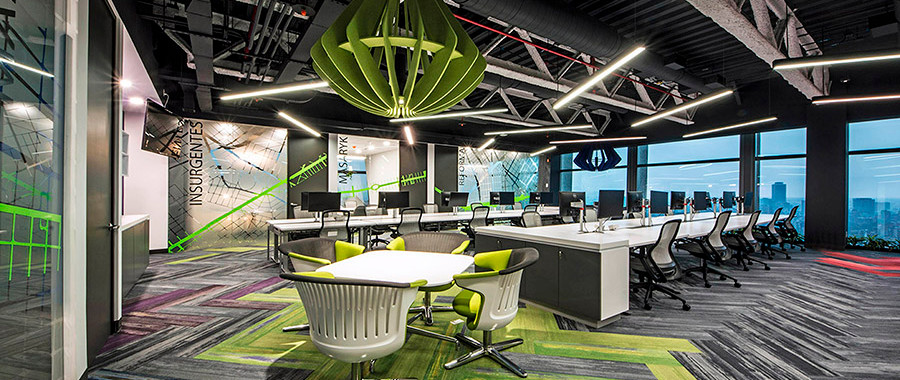 Estos parámetros fueron fundamentales para la elección de la paleta de color, el tipo de mobiliario y disposición de los espacios. El programa tenía que contemplar que tres áreas de negocio distintas convivieran en un área de descanso que no fuera una cafetería convencional y aburrida, sino un breakout que ayude a sentirse fuera de la oficina y poder despejar la mente; aquí se puede observar un remate visual muy divertido y colorido en el muro, mesas amplias que permiten la convivencia de grupo en un espacio con circulaciones amplias, bien iluminadas y ventiladas.
